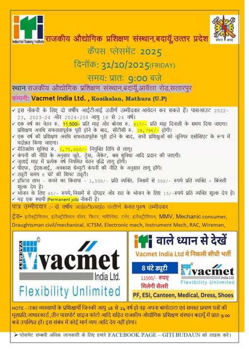 Vacmet India Job Campus 2025: All ITI pass youth are informed that a job campus is being organized by Vacmet India Pvt Ltd for the recruitment of ITI pass students, any youth who wants to work in this company can go to the Govt ITI Baduan on campus dates. If you also want to go for an interview in this campus, then read the information given below carefully.