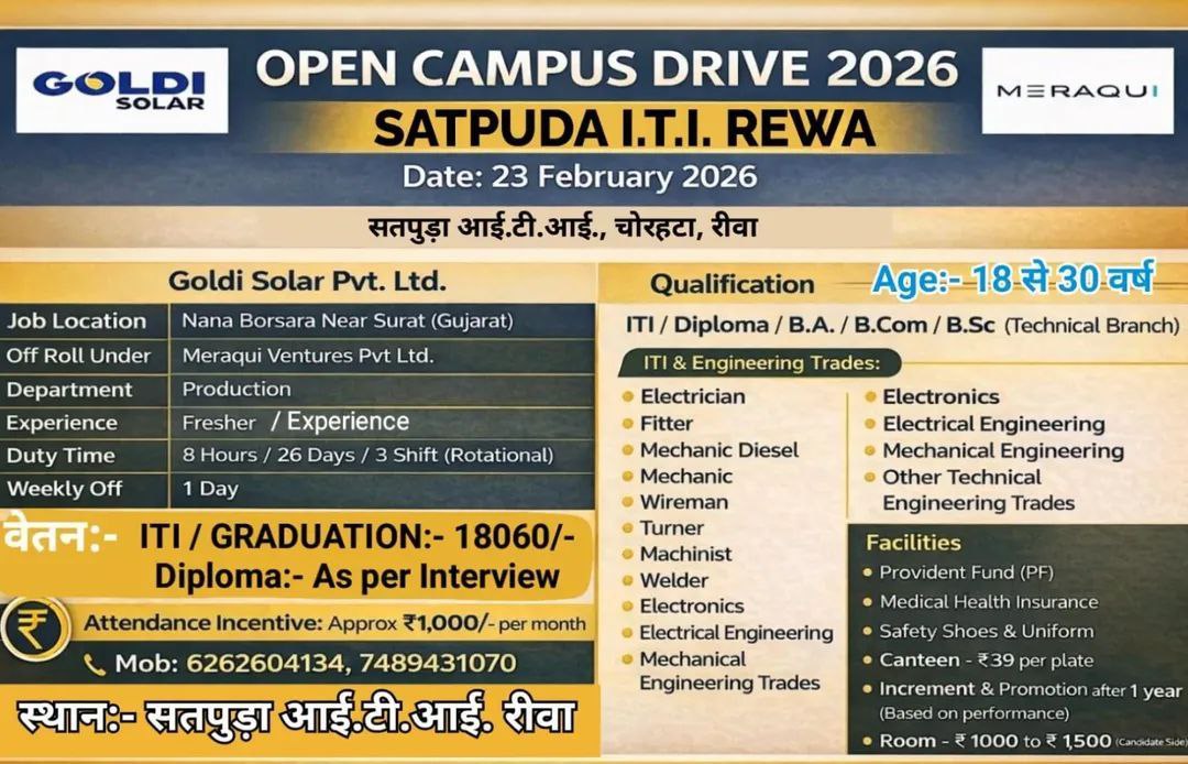 Goldi Solar Recruitment 2026: सभी आईटीआई/डिप्लोमा पास छात्रो के लिये Goldi Solar कंपनी मे जॉब प्राप्त करने का एक सुनहरा मौका है यह जॉब सभी राज्यों के अभ्यर्थी के लिये है यह कंपनी सोलर प्रोडक्ट बनती है जो भी युवा solar Industry  मे जॉब करना चाहते है उनके लिये यह बहुत ही बड़ा अवसर है इस कंपनी मे ड्यूटी टाइम 8 घंटे का है तथा हर रविवार का ऑफ रहता है Goldi Solar Recruitment 2026 Open Job Campus Drive से जुड़ी जानकारी निम्न प्रकार है :-