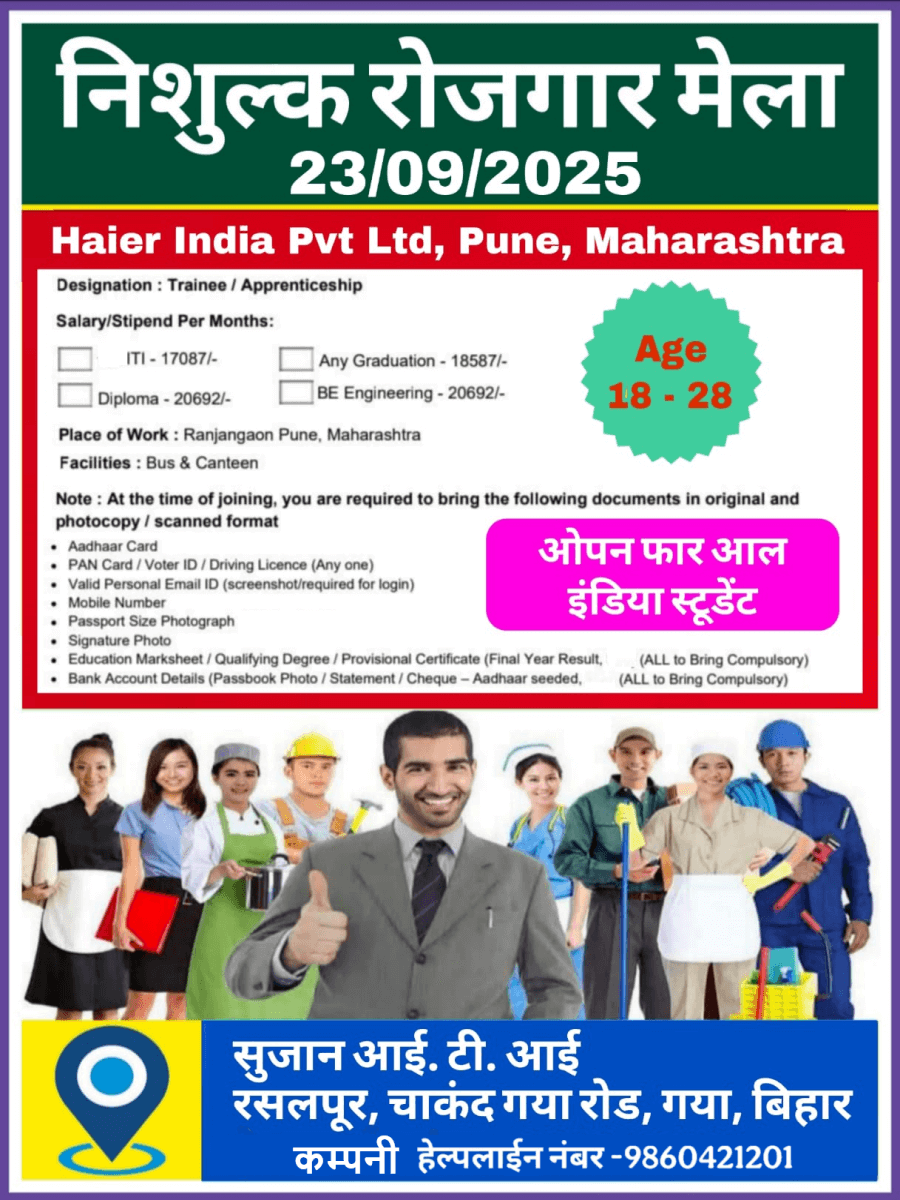 Haier Appliances Recruitment 2025: For all the unemployed young men, today we have brought information about the recruitment in Haier Appliances Company through the first news portal, let us tell you that in Haier Appliances Company, ITI pass students will be recruited on the posts of Trainee and let us tell you that the recruitment of Haier Appliances Company will be done in a very direct way. If you also want to work in this company, you can also go to this campus and give an interview and tell you that this recruitment is being organized absolutely free, the information about this campus is given below.
