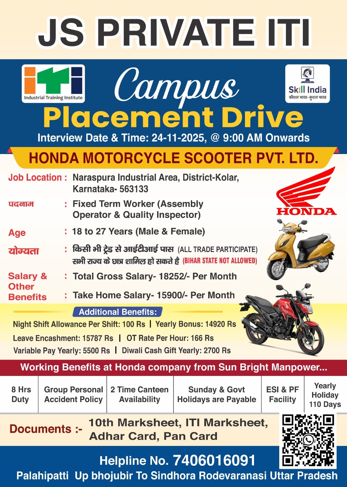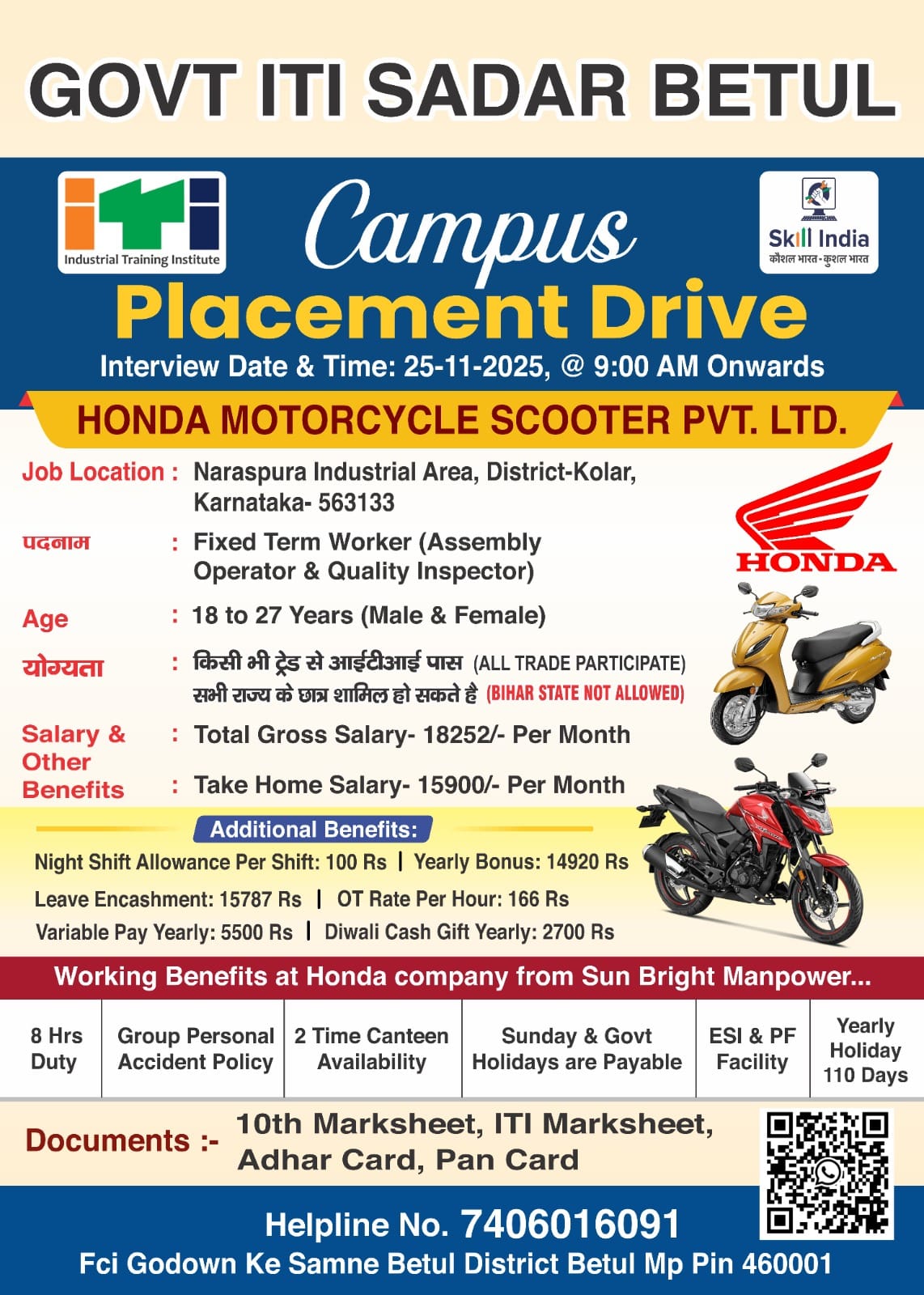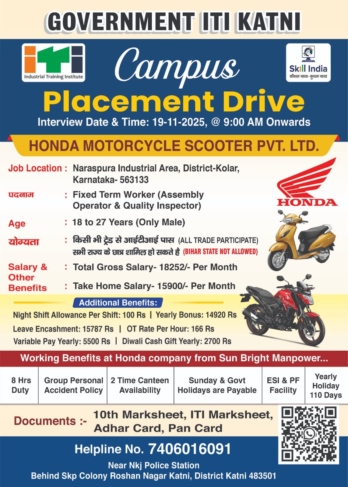 Honda Motorcyle Recruitment 2025| Latest ITI Jobs | Latest Honda Jobs | Campus Placement