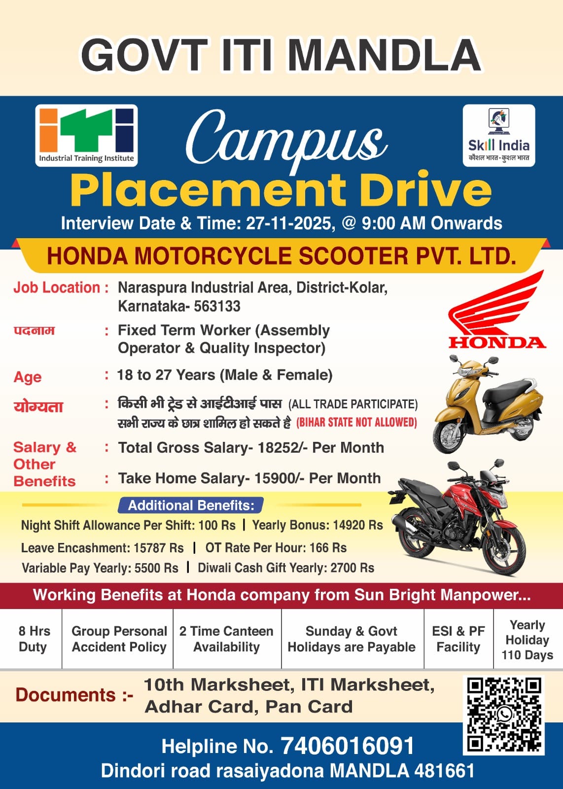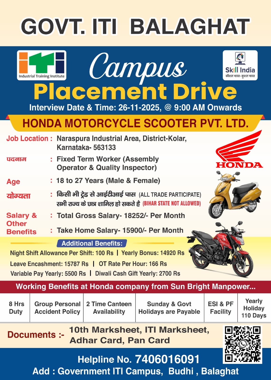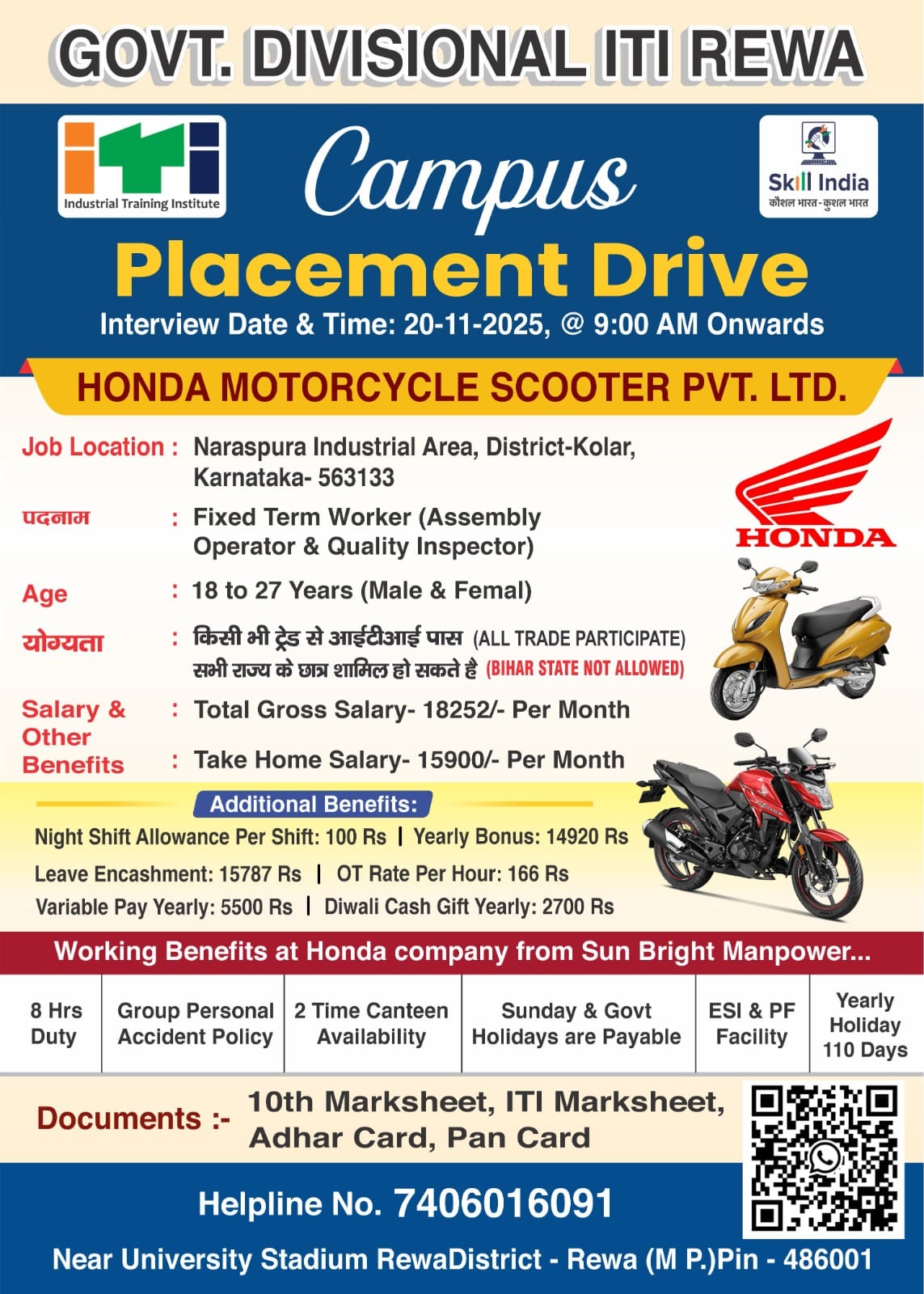 Honda Motorcyle Recruitment 2025| Latest ITI Jobs | Latest Honda Jobs | Campus Placement