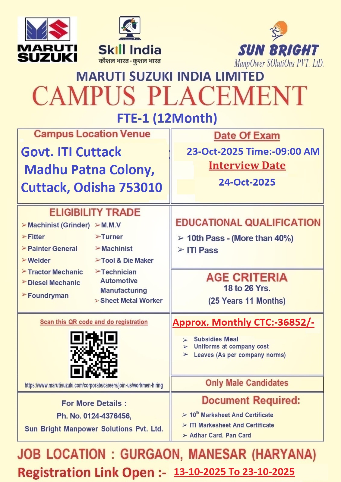 Maruti Suzuki FTE Gurgaon Recruitment 2025: If you are also unemployed and want to work in a big company, then let us tell you that the recruitment of FTE has come in Maruti Suzuki Gurgaon/Manesar . We will give you complete information related to this recruitment through this article. Let me tell you that Maruti Suzuki gives very good salary to the FTE candidate. FTE Hiring Is 1 Year But extendable up to 2 more years based on performance.