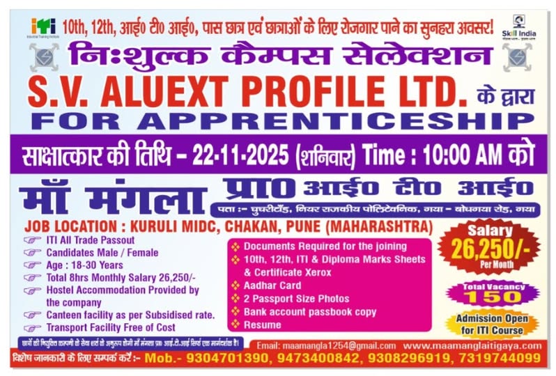 S.V. Aluext Profile Job Campus 2025: तकनीकी शिक्षा प्राप्त युवाओं के लिए रोजगार का सही अवसर ढूँढना हमेशा चुनौतीपूर्ण होता है। यदि आप ITI पास हैं और एक सुरक्षित, स्थिर तथा विकासशील करियर की तलाश में हैं, तो यह समाचार आपके लिए अत्यंत महत्वपूर्ण है। S.V. Aluext Profile Ltd. ने 22 नवंबर 2025 को माँ मंगला ITI, गया में एक बड़े जॉब कैंपस ड्राइव की घोषणा की है। इस कैंपस में कुल 150 पदों पर भर्ती की जाएगी, जिसमें 18 से 30 वर्ष तक के पुरुष एवं महिला दोनों उम्मीदवार आवेदन कर सकते हैं।